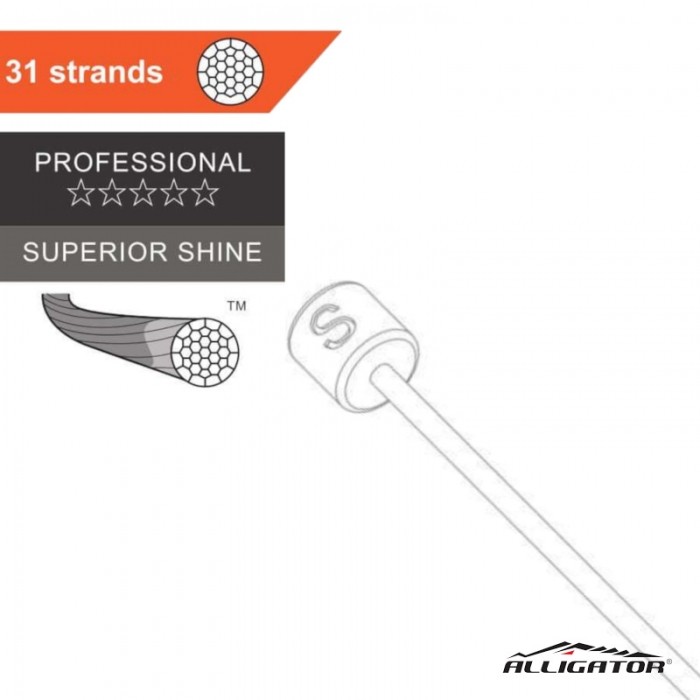 Cięgno przerzutki marki ALLIGATOR. Linka 31-żyłowa ze stali nierdzewnej. Szlifowanie SuperiorShine. Końcówka Shimano 4.4 x 4.4mm. Średnica: 1.1mm. Długość: 3000mm.