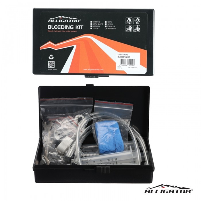 Zestaw marki ALLIGATOR do odpowietrzania hamulców hydraulicznych.