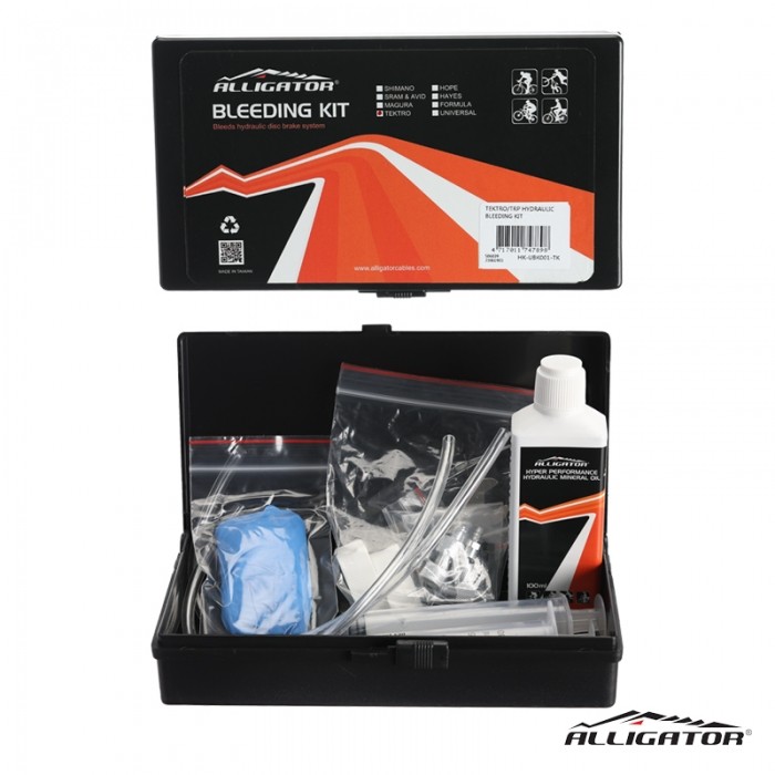 Zestaw marki ALLIGATOR do odpowietrzania hamulców hydraulicznych. Do systemów Tektro.