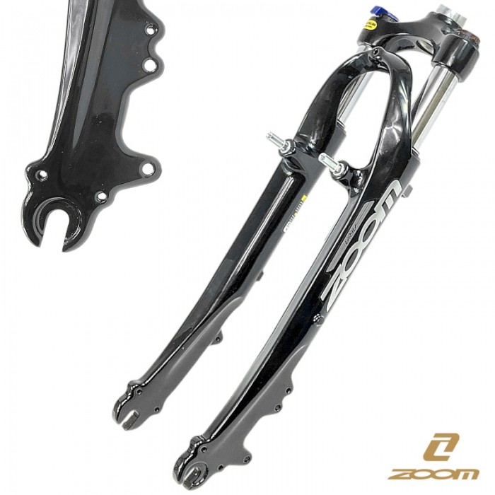 Widelec ZOOM. Amortyzowany (Sprężyna+Elastomer). Rozmiar: 700C. Rura sterowa: Ahead 28.6x240mm. Skok: 45mm. Korona: Alu A380.2. Golenie: 25.4mm Stal. Ramiona: Alu. ML/O - mech. blokada skoku. Piwoty VB. Mocowanie ham.tarcz. IS i rolkowego. WAGA: 1.75kg