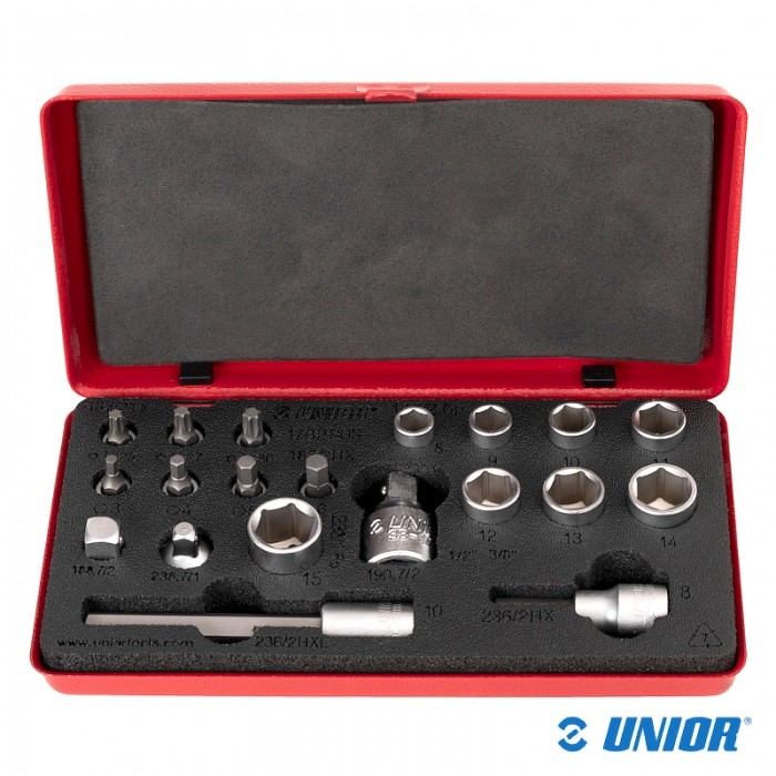 Zestaw bitów i nasadek marki UNIOR. Zestaw zawiera: bity Torx T25/T27/T30, bity imbusowe 3/4/5/6/8/10mm, nasadki 8/9/10/11/12/13/14/15mm, adaptery 1/4"-3/8" i 3/8"-1/4". Mogą być używane z kluczami dynamometrycznymi lub grzechotkami.