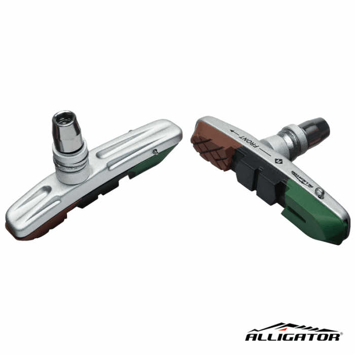 Klocki marki ALLIGATOR hamulcy obręczowych. Kartrydżowe. Obudowa: Aluminium, Srebrna. Do szczęk typy V-Brake. Długość 72mm. Mocowanie: Nakrętka. Wkładki do obręczy aluminiowych, 3-kolorowe. WAGA: ok.56gram