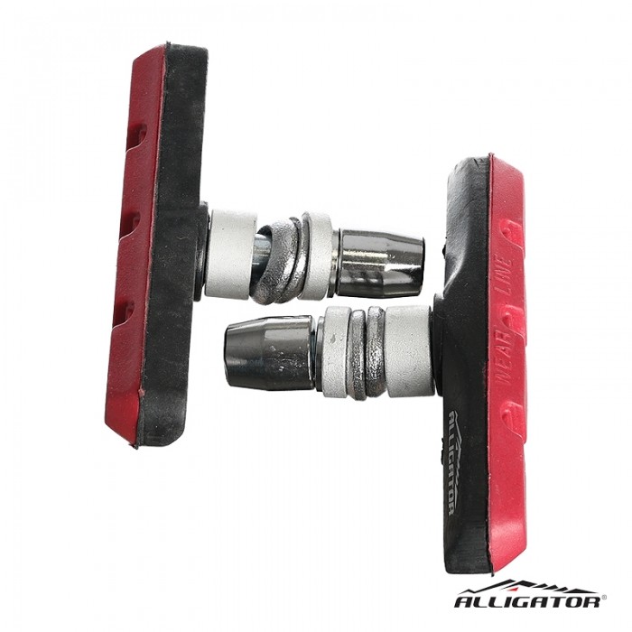 Klocki marki ALLIGATOR hamulcy obręczowych. Do szczęk typu V-Brake. Długość 70mm, symetryczne. Mocowanie: Nakrętka. Do obręczy aluminiowych, czarno-czerwone. WAGA: ok.64gram