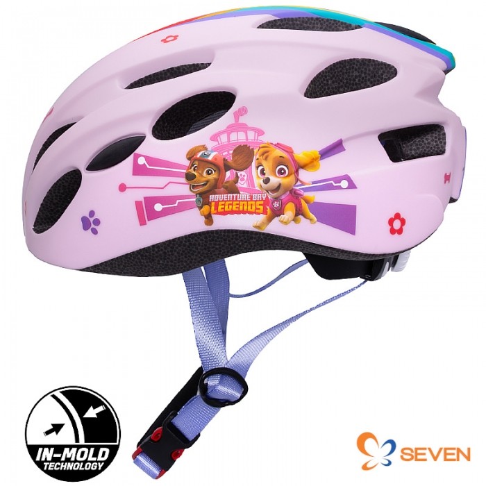 Kask dziecięcy marki SEVEN. Wykonany w technologii IN-MOLD.Przeznaczony do jazdy na rowerze, rolkach, wrotkach i hulajnodze. Rozmiar "M" (52 - 56cm). Waga: 210gram