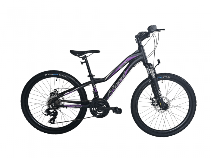 Rower marki R'LAND. Model QUATRO. Rozmiar kół: 24". Rama aluminiowa. Widelec aluminiowy, amortyzowany. Koła aluminiowe. Przerzutki 3x7s Shimano. Manetki RevoShift. Hamulce tarczowe, mechaniczne. Akcesoria: Odblaski P/T. Kolor: CZARNO-FIOLETOWY
