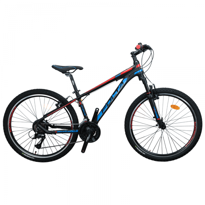 Rower marki FOLTA. Model ITHAVO. Rama: Aluminiowa 14". Widelec: amortyzowany. Koła: 26", aluminiowe. Przerzutki: 3x7 Shimano. Manetki: STEF. Hamulce: V-Brake. Kolor: CZARNO-NIEBIESKO-CZERWONY