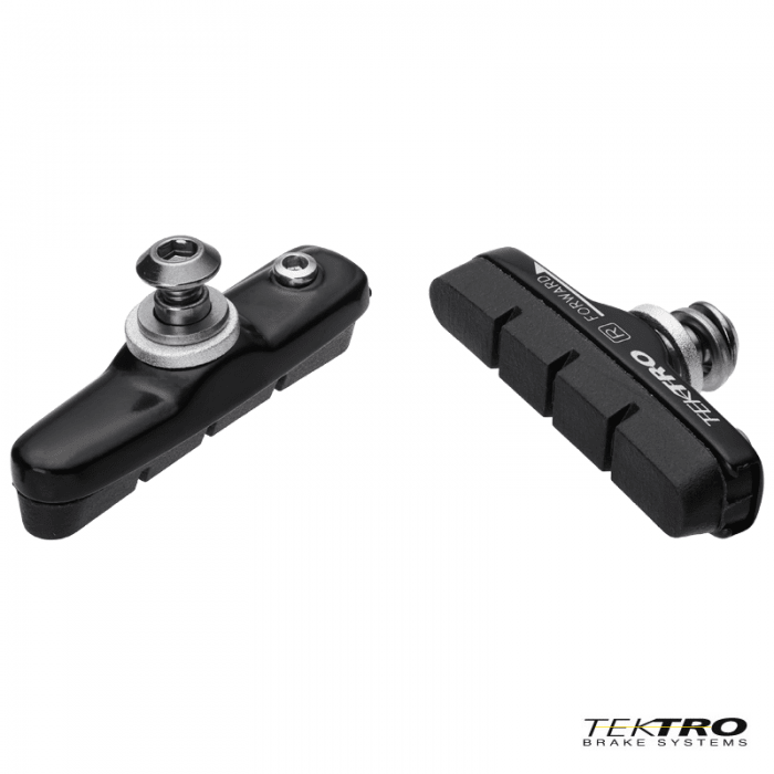 Klocki hamulca marki TEKTRO. Kartrydżowe, symetryczne. Obudowa odlewana z aluminium, mocowanie na nakrętki. Długość: 55mm. Do szczęk szosowych typu Caliper. Okładziny do obręczy aluminiowych.