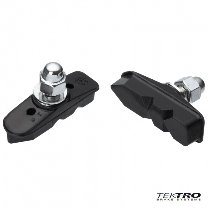 Klocki hamulca marki TEKTRO. Do szczęk typu Caliper. Mocowanie na nakrętki (trzpień 12.5mm). Długość: 45mm. Kąt 8'. Okładziny do obręczy stalowych.