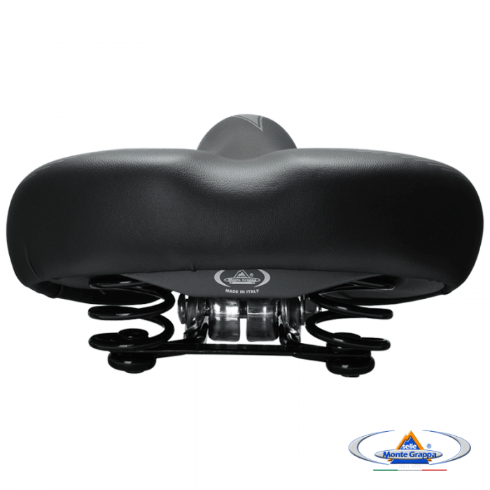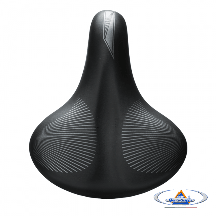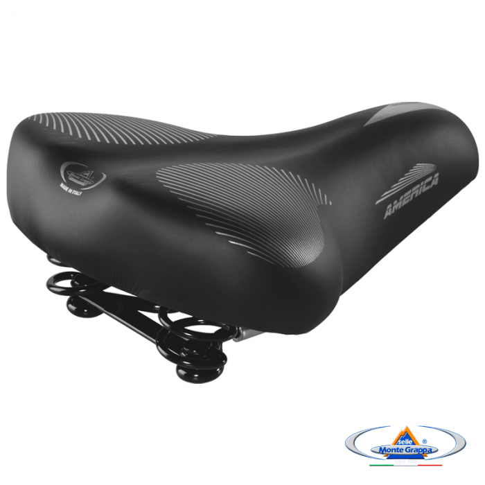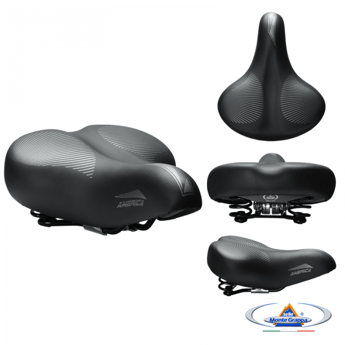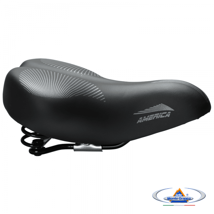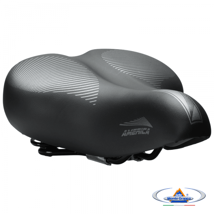 Siodło marki SELLE MONTEGRAPPA. Model AMERICA. Długość 265mm. Szerokość 215mm. Szyny stalowe, okrągłe, na sprężynach. Wypełnienie: SMG Memory Foam. Pokrycie: skóra syntetyczna. Skorupa: PPE. Waga ok. 743gram
