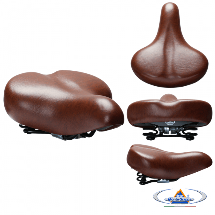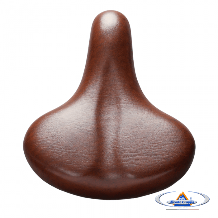 Siodło marki SELLE MONTEGRAPPA. Model AMERICA. Długość 265mm. Szerokość 215mm. Szyny stalowe, okrągłe, na sprężynach. Wypełnienie: SMG Memory Foam. Pokrycie: skóra syntetyczna. Skorupa: PPE. Waga ok. 743gram