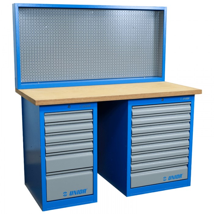 Modułowy stół warsztatowy marki UNIOR. Składa się z: blat drewniany 990TW o wymiarach 1500x750x40mm, szafka wąska 990ND6 z 6 szufladami, szafka szeroka 990WD8 z 8 szufladami, tablica narzędziowa 946C. !! UŻYWANY !! rysy na blacie drewnianym, drobne otarcia powłoki lakierniczej elementów stalowych, wykorzystywany był do prezentacji marki na stoisku targowym.